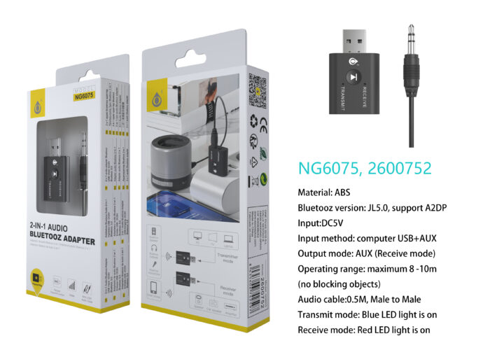 • NG6075 NE Adaptador Bluetooth 5.0, Con funcion de Transmisor y Receptor, cable audio 0.5m, Negro