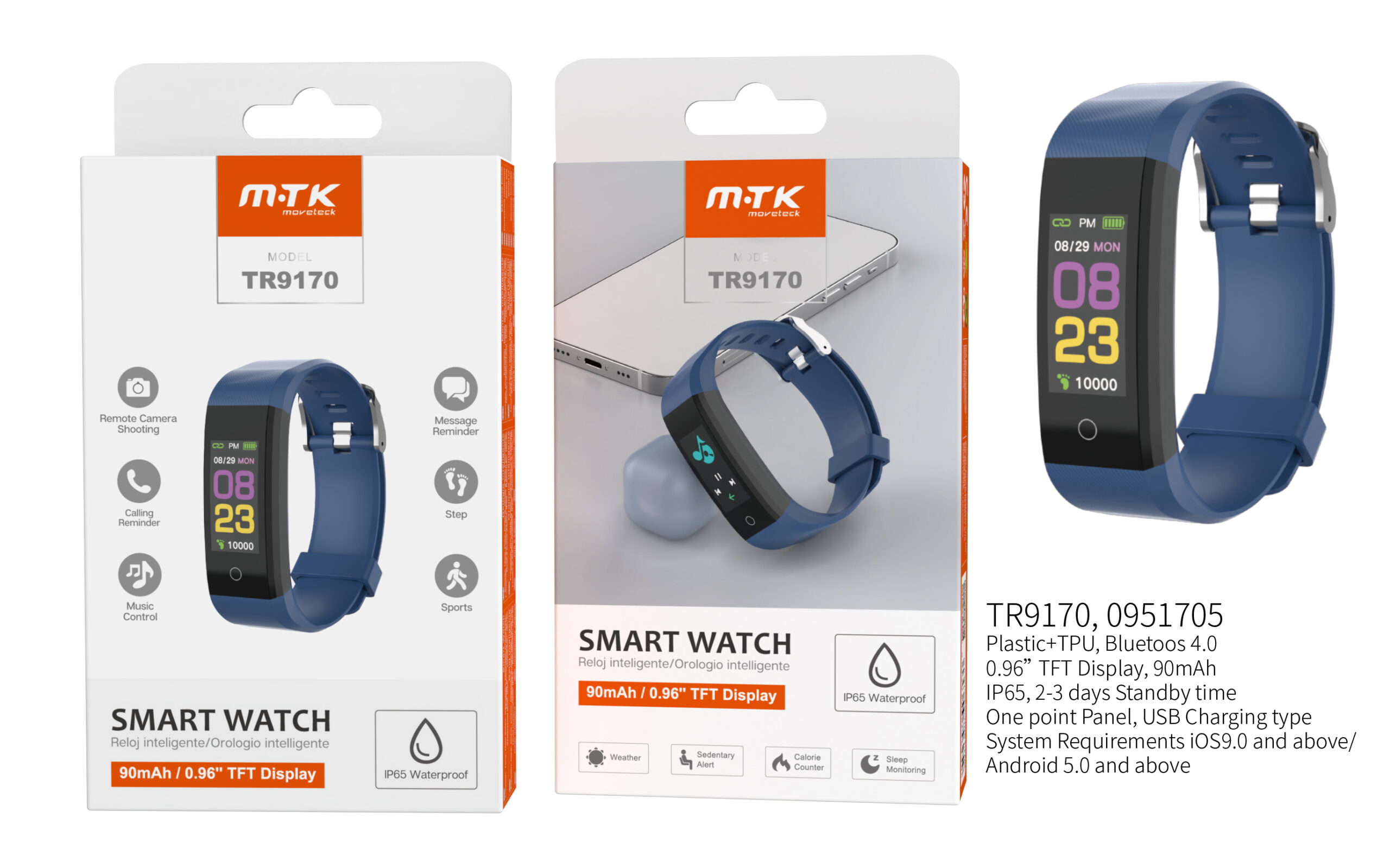 RT9170 AZ Pulsera de actividad Smart Watch Impermeable IP65, bateria 90mA ,Para Andriod y IOS,Azul