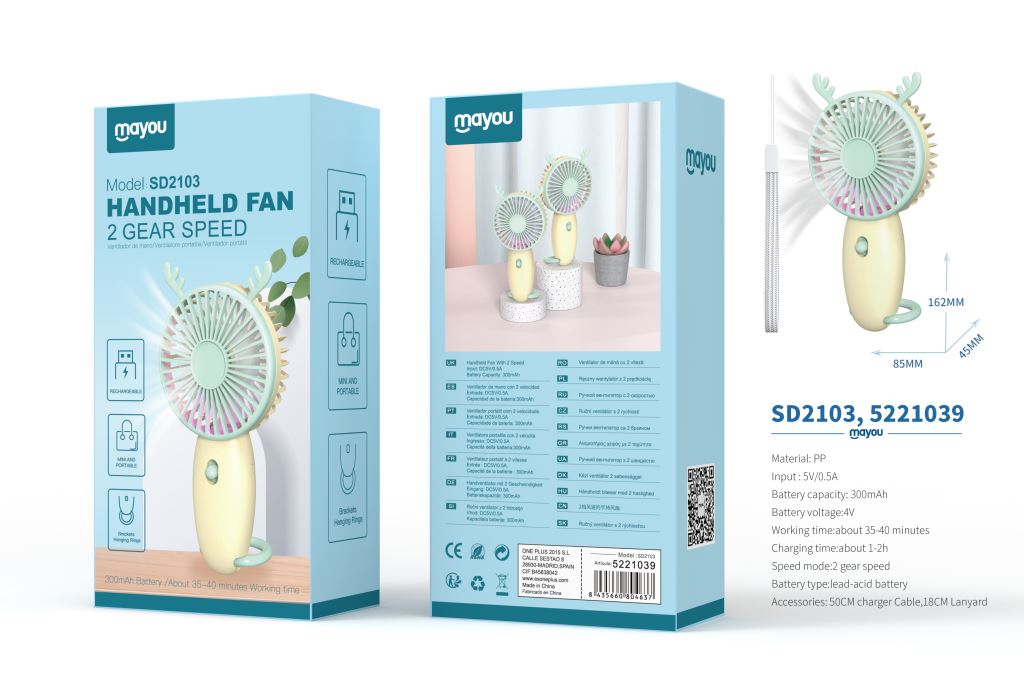• SD2120 Mini Ventilador de mesa, 1 Velocidad, baterias recargable de plomo acido 300mAh, Azul+Blanco