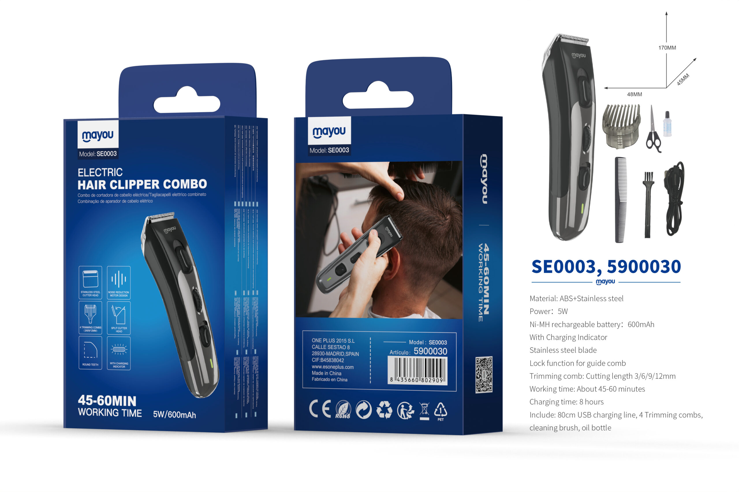 SE0003 NE Maquina Cortarpelo con 1 peines( incluye kit de limpieza/ un peine/tijera), Bateria 600mAh/5W, Negro