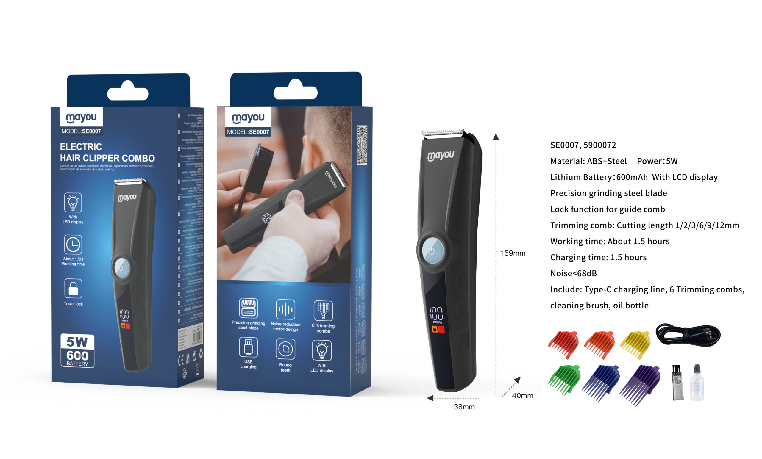 SE0007 NE Maquina Cortarpelo con indicador LED y 6 peines( incluye kit de limpieza), Bateria 600mAh/5W, Negro