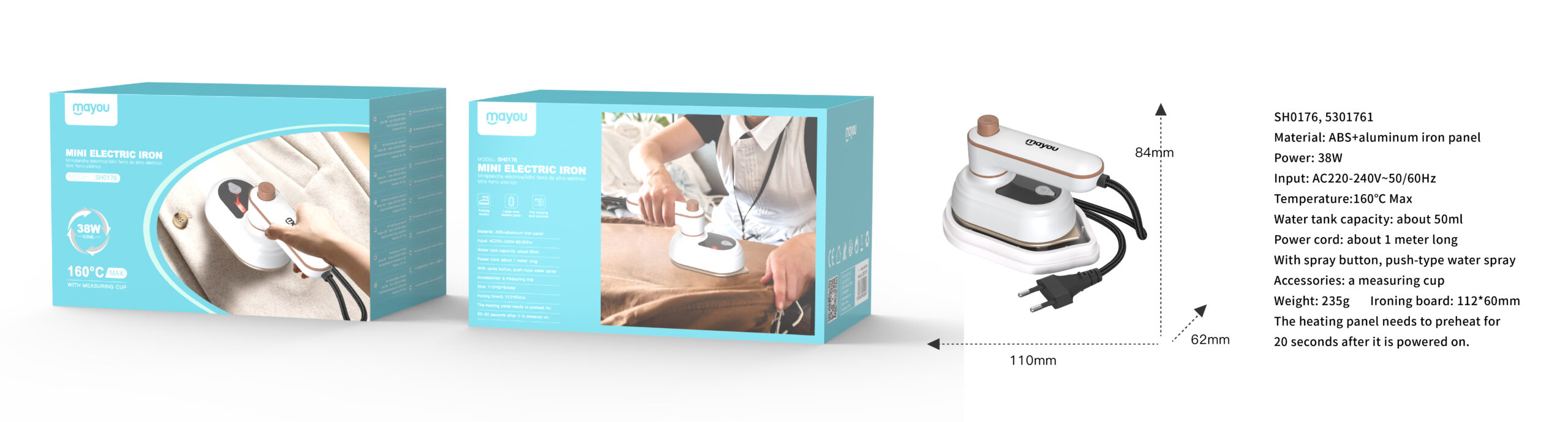 SH0176 BL Mini plancha de ropa para viaje, Deposito 50ml, Potencia 38W/160°C max, Cable 1M, Blanco
