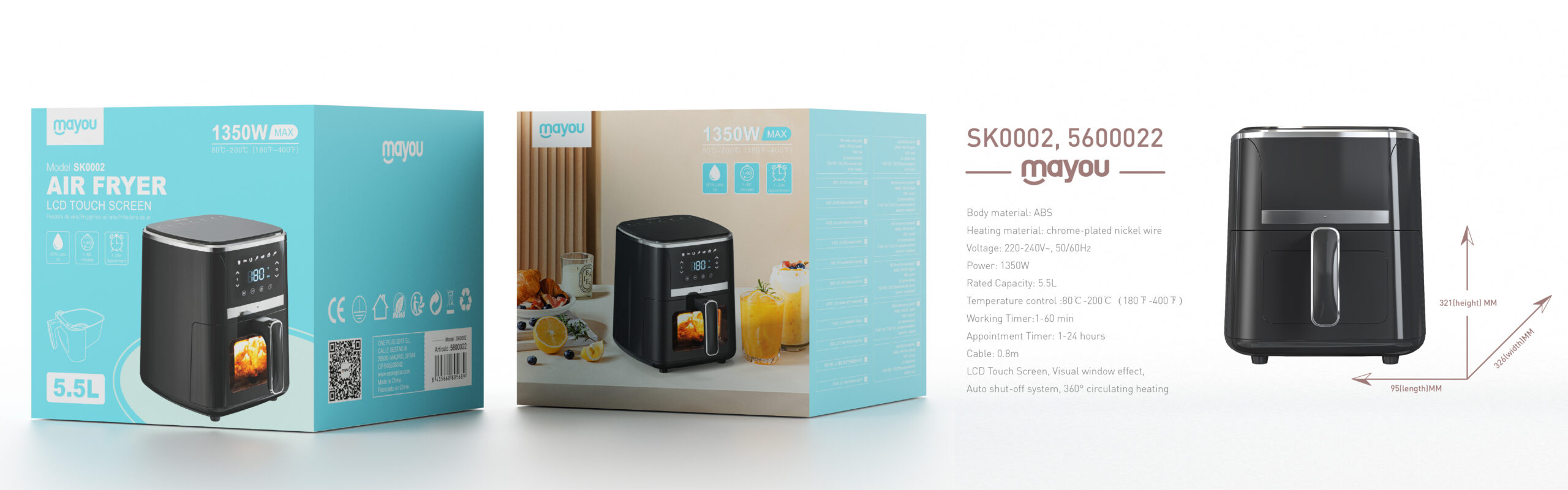 SK0002 NE Freidora de Aire sin Aceite con panel tactil,  olla Antiadherente, Volumen 5.5L, 1300W, 80-200ºC, Tiempo y Temperatura Preajustable,Cable 0.8M,  Azul
