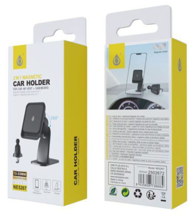 NE5267 NE Soporte Universal de movil Magnetico 2 en 1(Salpicadero,Parabrisa y airvent) 360° giratoria,Clip Retractil 13-33mm, Negro