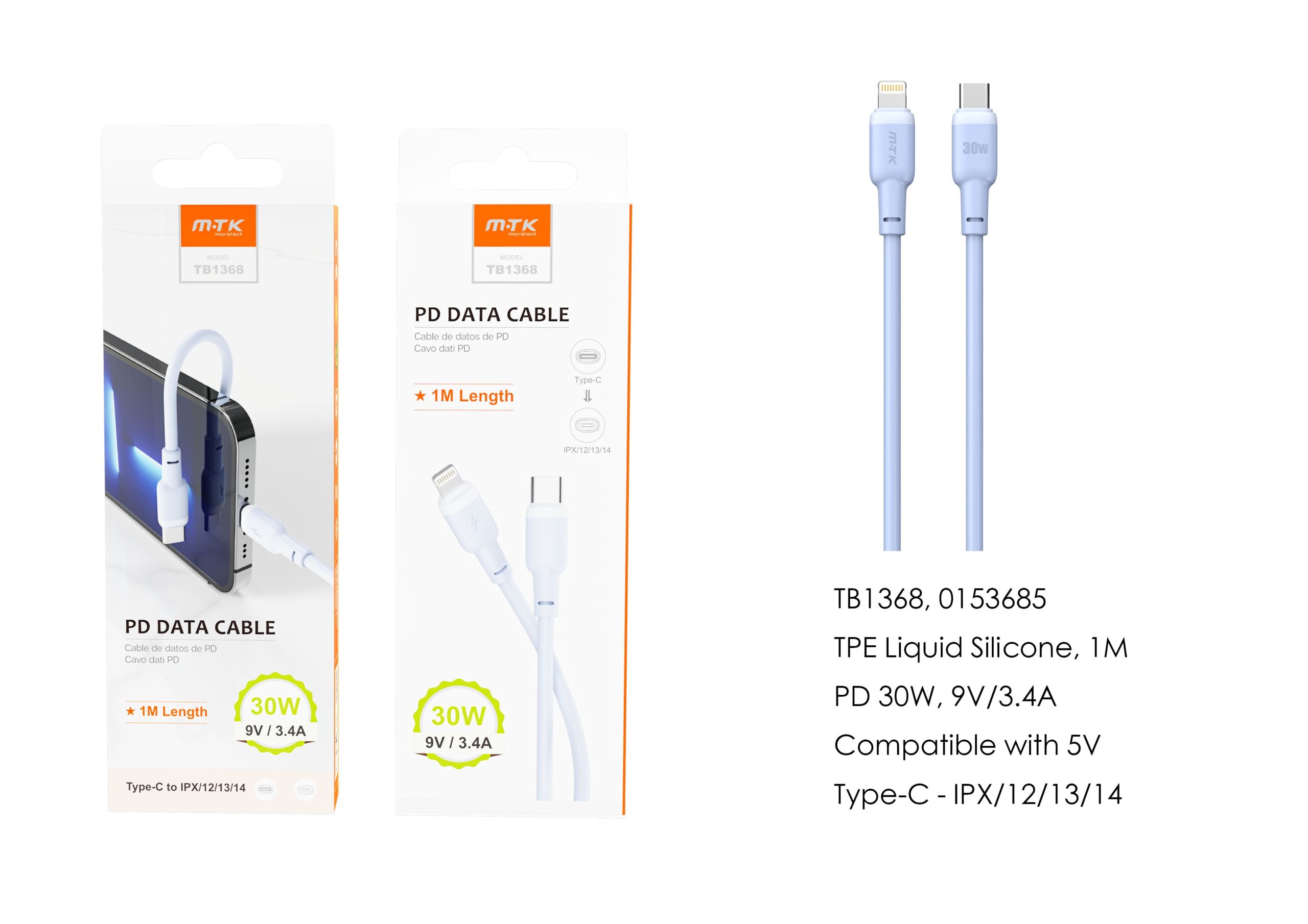 • TB1368 NE Cable de datos TPE para Type-C a Lightning , Carga Rapida PD, 30W/9V/3.4A, 1M, Negro