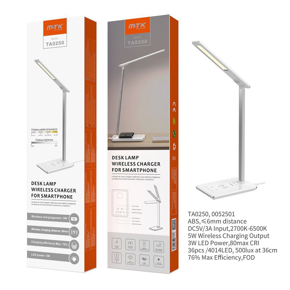 TA0250 BL Lámpara metal de mesa LED 3W con Cargador inalambrico para Moviles 5W y 1USB, Color (blanco o amarillo) y Brillo de Luz ajustable, con funci