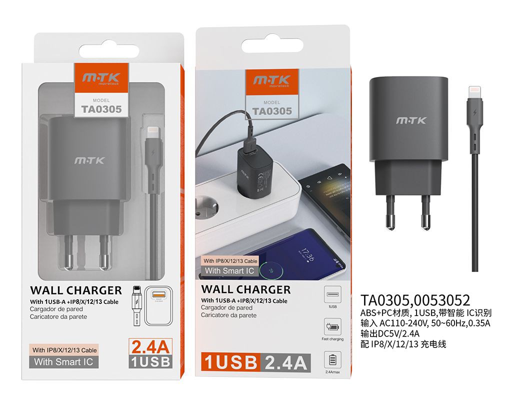 TA0305 NE Cargador de Pared Milky, con Cable para IP 5-13, con Chip de Reconocimiento Inteligente,