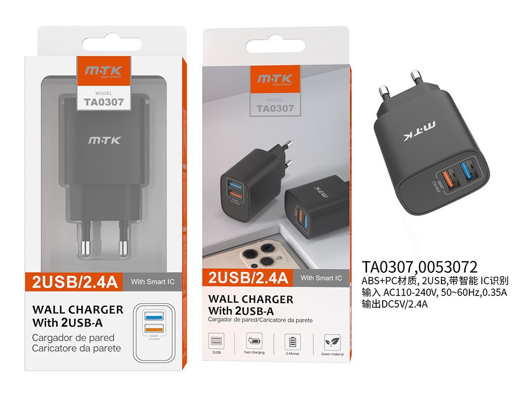 TA0307 NE Cargador de Pared Milky sin cable con Chip de Reconocimiento Inteligente, 2 USB, 2.4A, Negro
