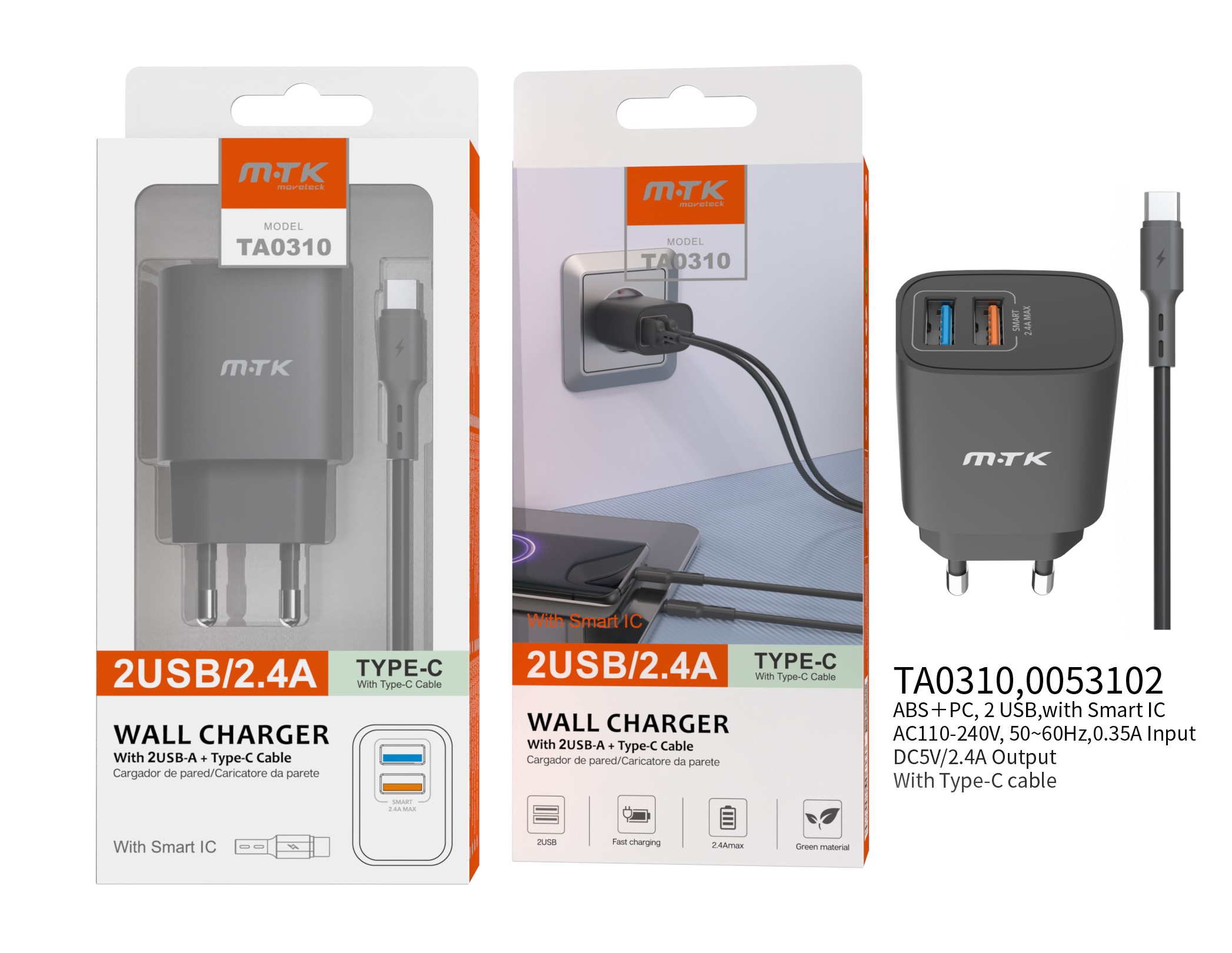 TA0310 NE Cargador de Pared Milky, con cable TYPE-C, Chip de Reconocimiento Inteligente 2USB, 2.4A, Negro