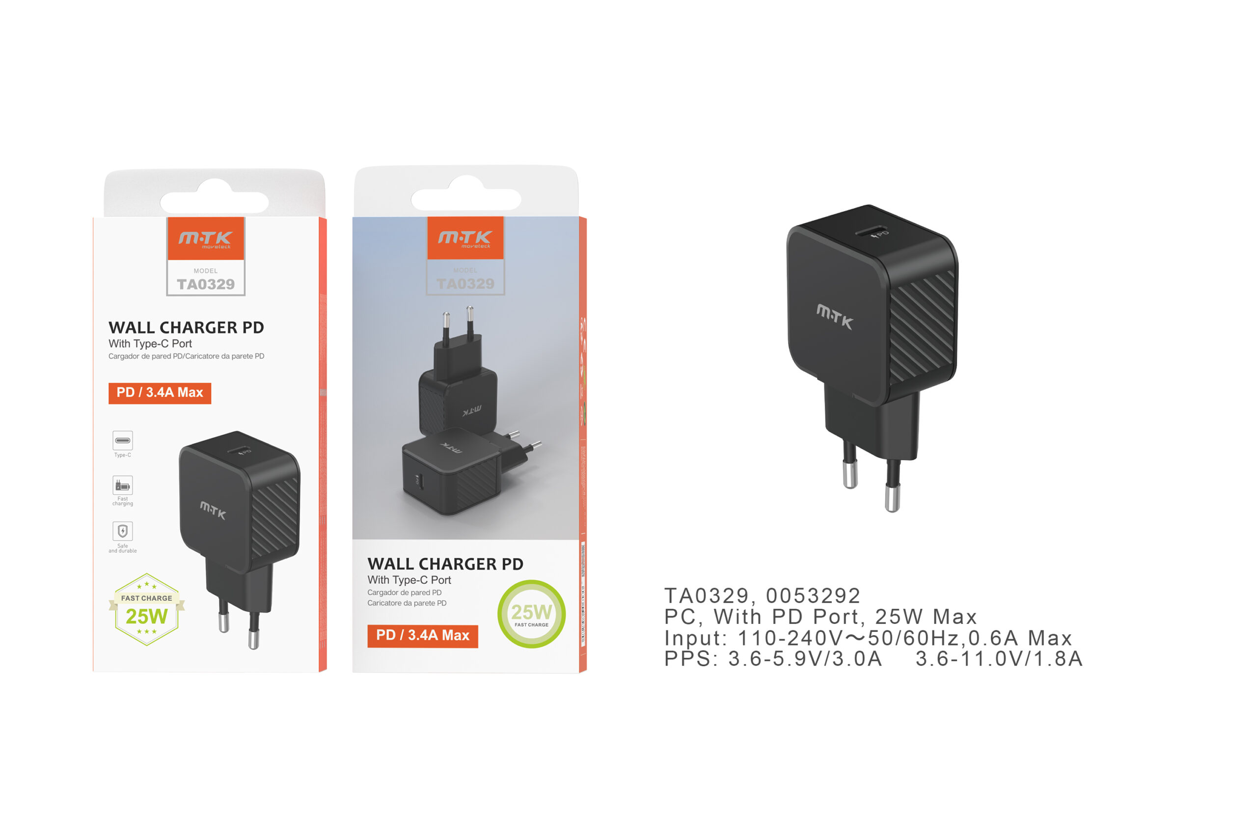 TA0329 NE Cargador de Red Rapida Fay , 1 puerto PD, Sin Cable 25W/3.4A(Max), Negro