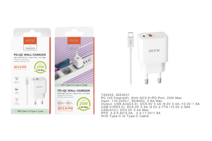 • TA0353 NE Cargador de Red Rapida Taylor , 2 puerto (Type-C PD + QC3.0) , Con Cable Type-C a Type-C , 25W/3.4A(Max), Negro
