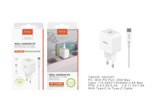 TA0330 BL Cargador de Red Rapida Fay , 1 puerto PD, con Cable Type-C a Type-C, 25W/3.4A(Max), Blanco