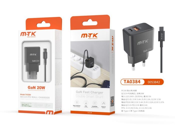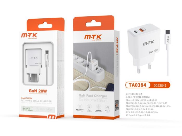 • TA0347 BL Cargador Rapido de Pared Marga Sin cable , Entrada Type-C(PD)+QC3.0)/30W/3A Max , Blanco