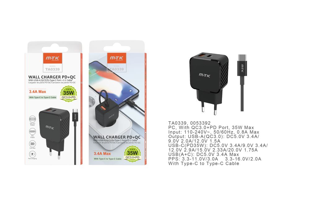 TA0339 NE Cargador de Red Rapida Fay , 2 puertos USB-C PD+QC 3.0, Con Cable Type-C a Type-C , 35W/3.4A(Max), Negro