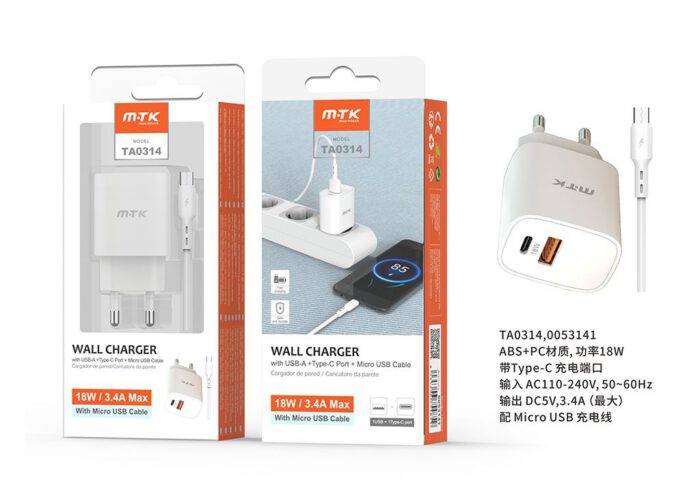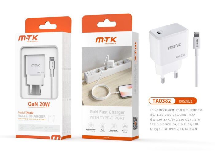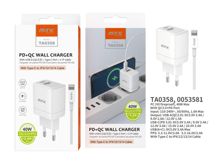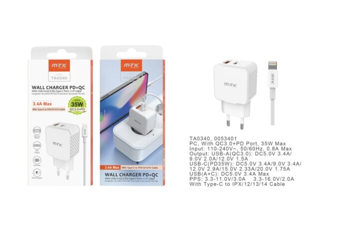 TA0340 BL Cargador de Red Rapida Fay , 2 puertos USB-C PD+QC 3.0, Con Cable Type-C a Lightning , 35W/3.4A(Max), Blanco