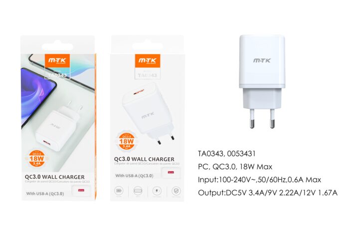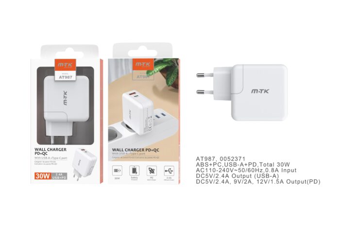 • AT987 BL Cargador de Red Rapida Alta Calidad M.TK Premium Eliria sin cable , 1USB(2.4A),1 PD3.0 18W, Blanco