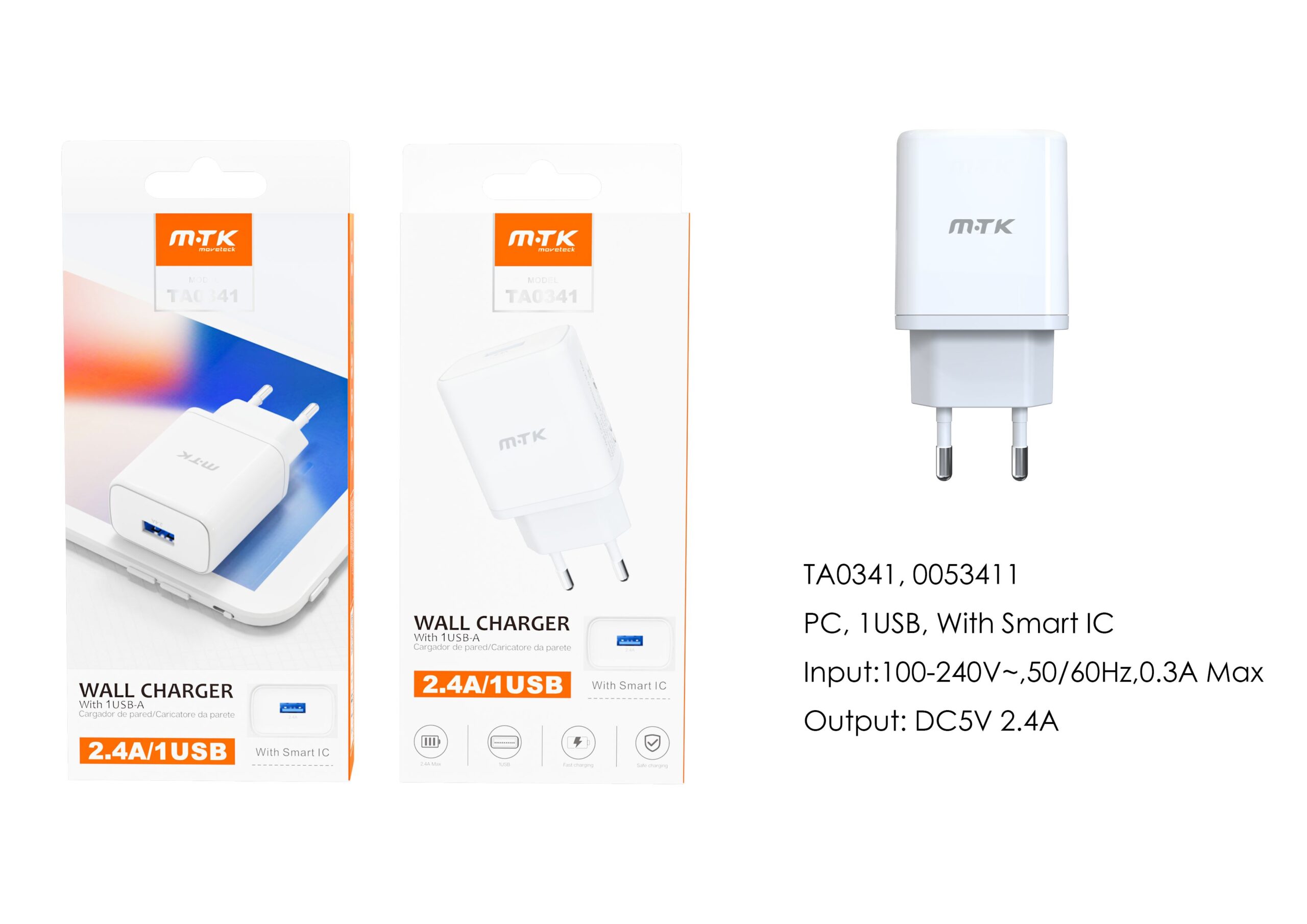 TA0341 BL Cargador de Red Marga 1 USB Sin cable, Con Chip de Reconocimiento Inteligente, 5V/2.4A , Blanco