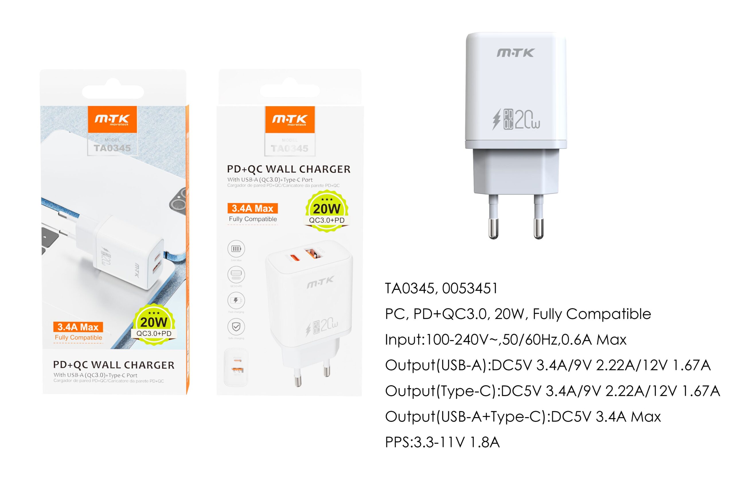 TA0345 BL Cargador Rapido de Pared Marga Sin cable , Entrada Type-C(PD)+QC3.0)/20W/3.4A Max , Blanco