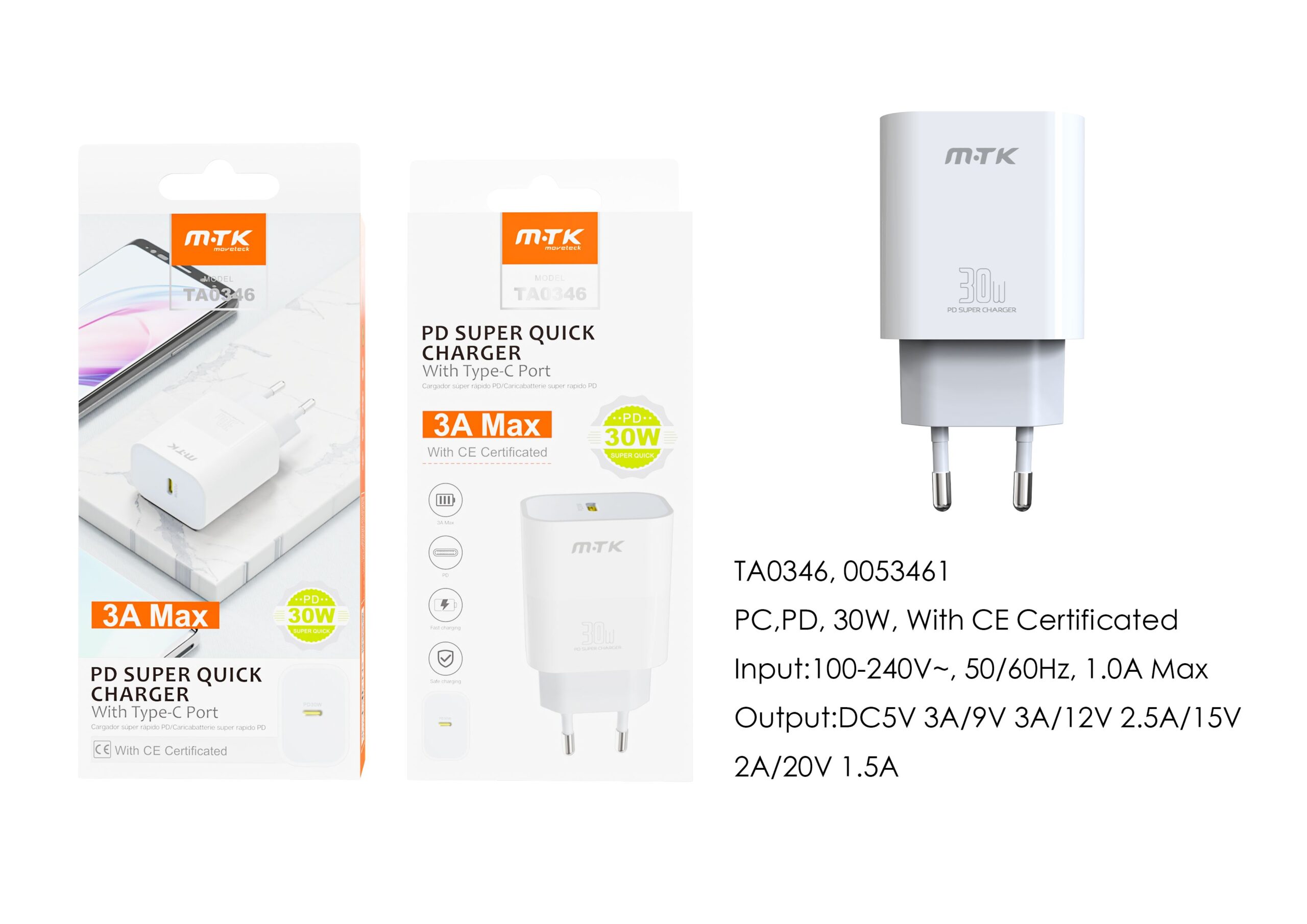 TA0346 BL Cargador Rapido de Pared Marga Sin cable , Entrada Type-C(PD)/30W/3A Max , Blanco