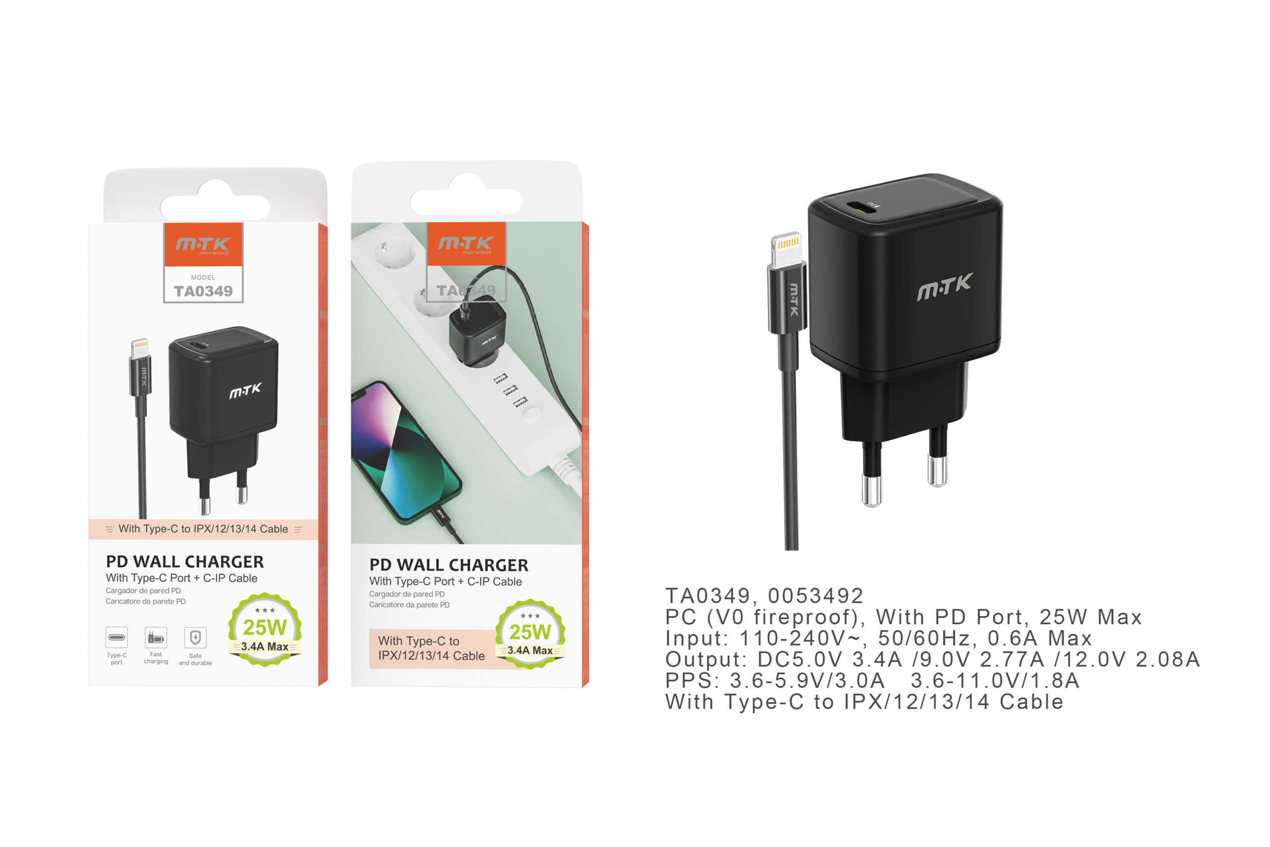 TA0349 NE Cargador de Red Rapida Taylor , 1 puerto Type-C (PD), con Cable Type-C a Lightning , 25W/3.4A(Max), Negro