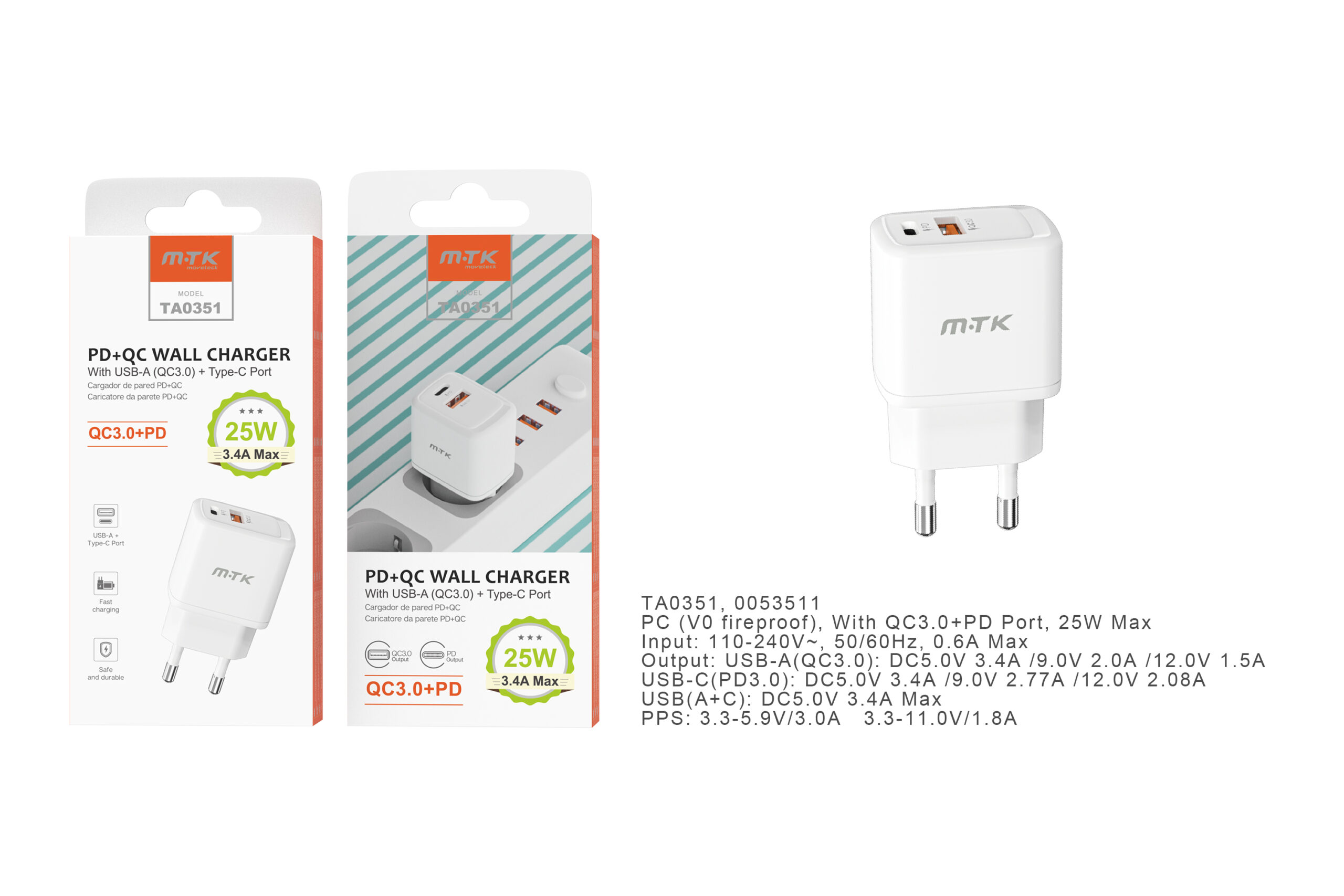 TA0351 BL Cargador de Red Rapida Taylor , 2 puerto (Type-C PD + QC3.0) , Sin Cable , 25W/3.4A(Max), Blanco