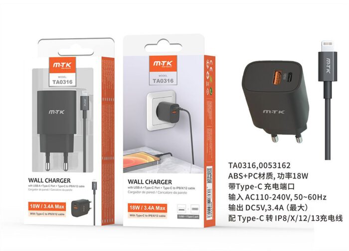 TA0352 NE Cargador de Red Rapida Taylor , 2 puerto (Type-C PD + QC3.0) , Con Cable Lightning , 25W/3.4A(Max), Negro