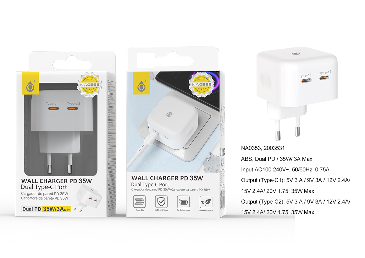 TA0353 BL Cargador de Red Rapida Taylor , 2 puerto (Type-C PD + QC3.0) , Con Cable Type-C a Type-C , 25W/3.4A(Max), Blanco