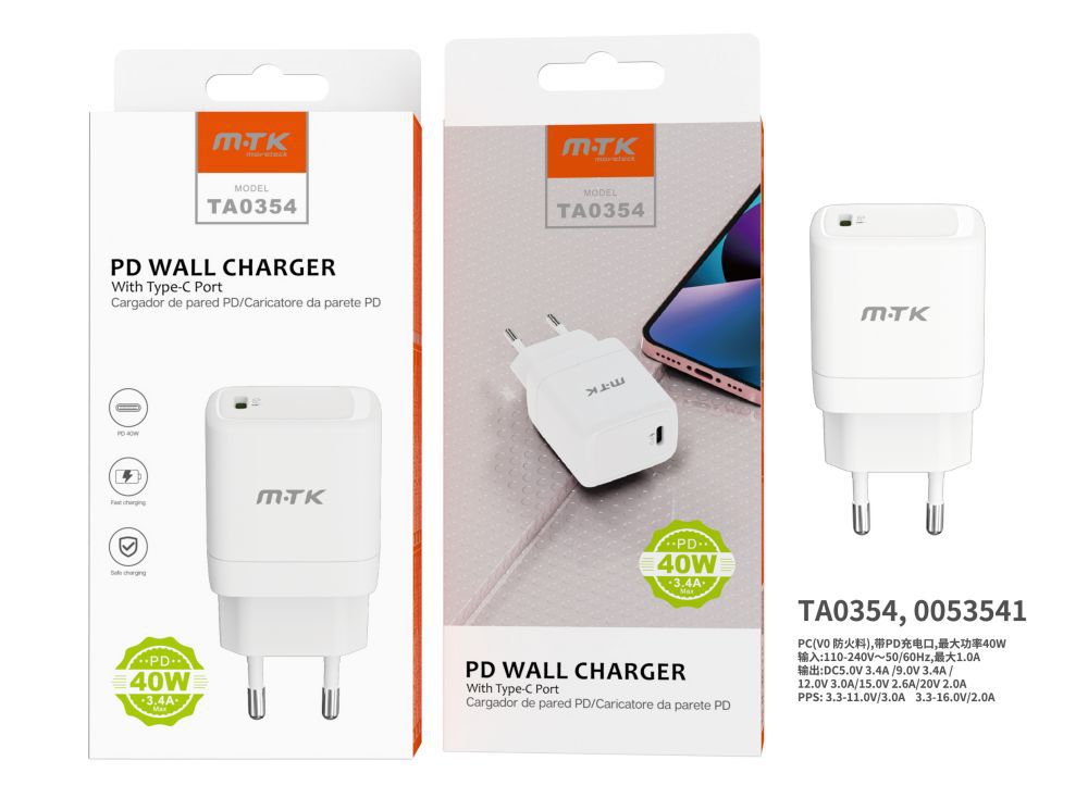 TA0354 BL Cargador de Red Rapida Taylor , 1 puerto Type-C PD, Sin Cable 40W/3.4A(Max), Blanco