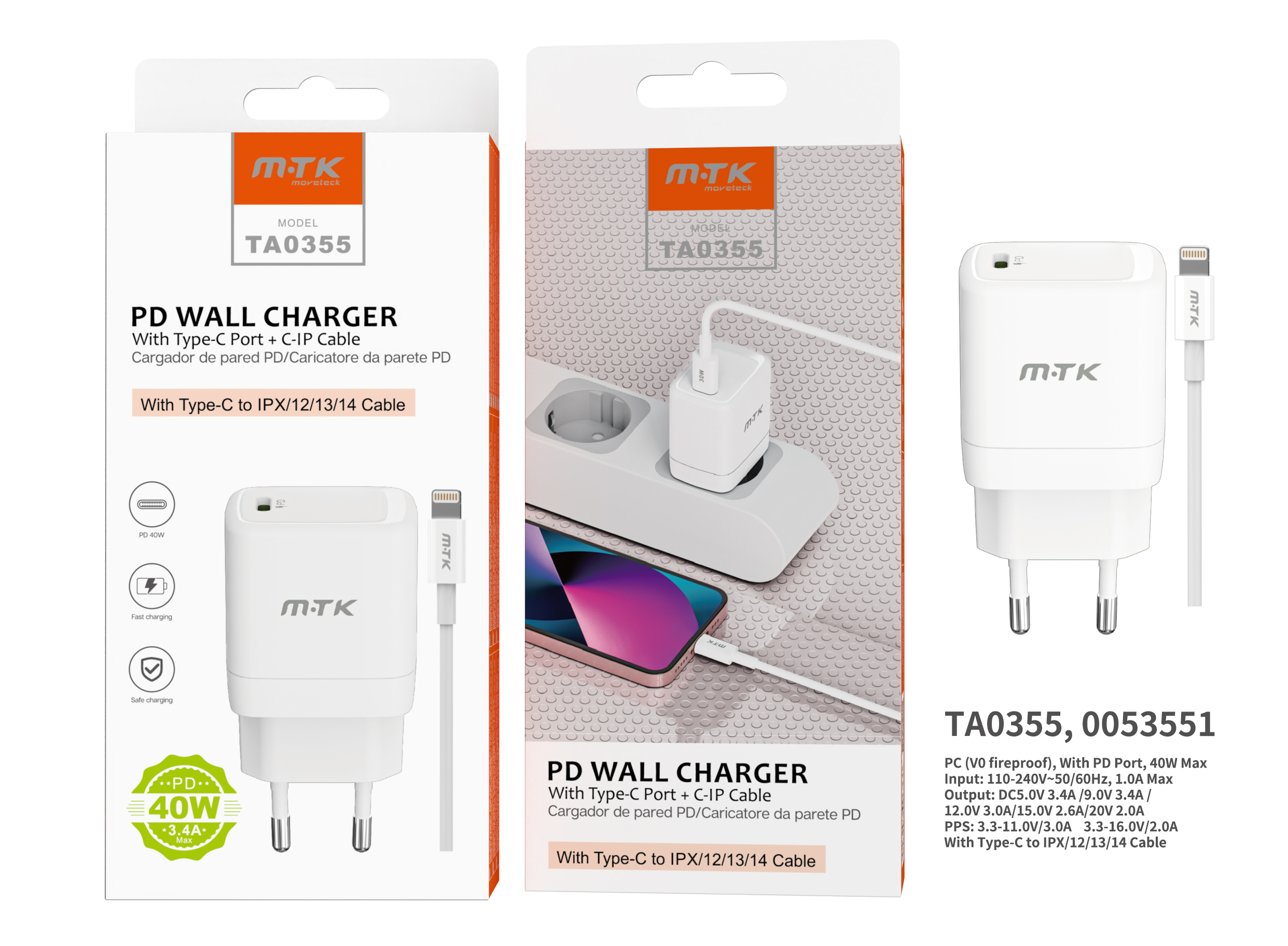 TA0355 BL Cargador de Red Rapida Taylor , 1 puerto Type-C PD, con Cable Type-C a Lightning , 40W/3.4A(Max), Blanco