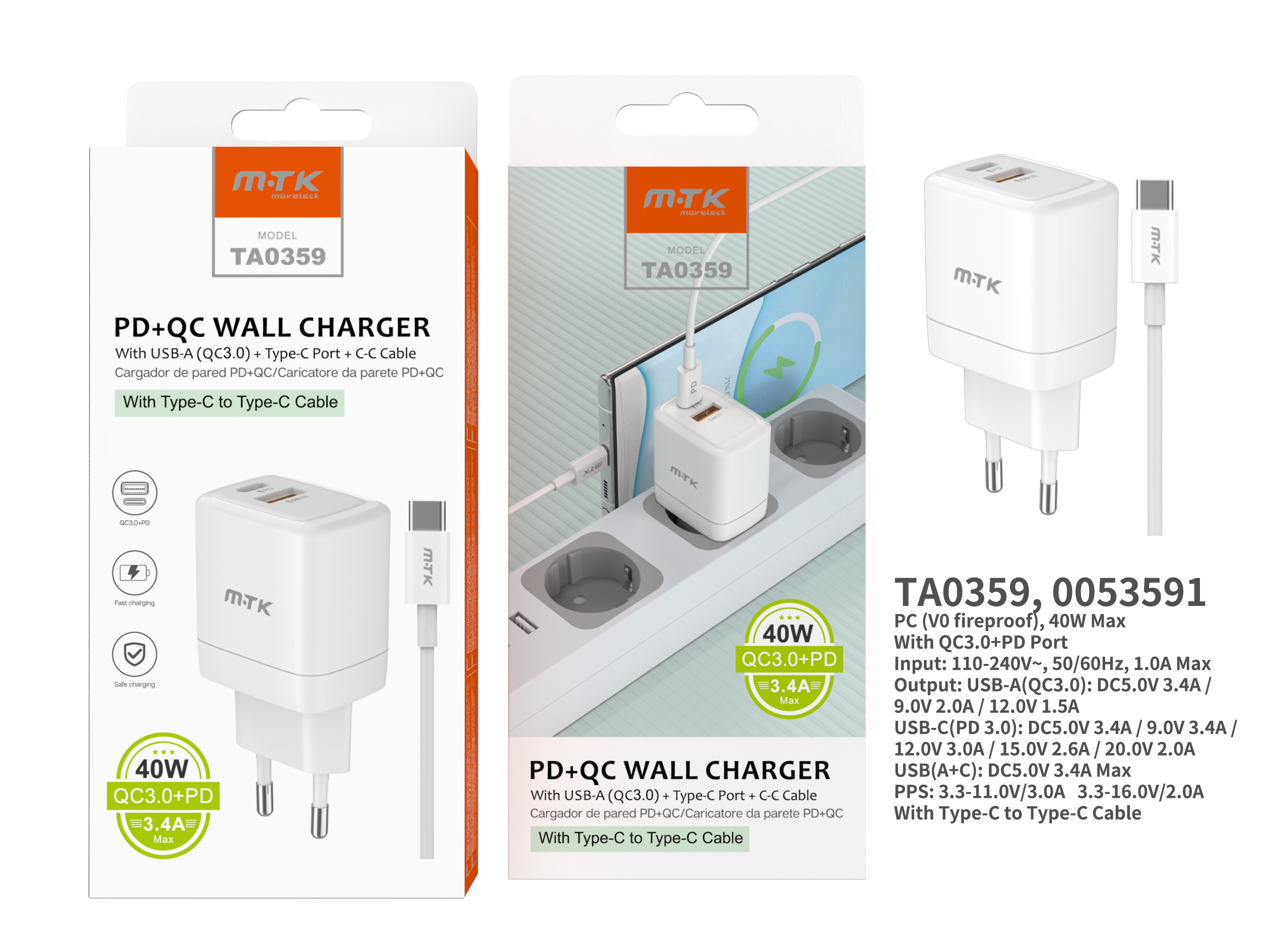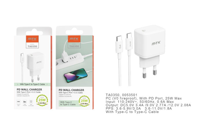 TA0359 BL Cargador de Red Rapida Taylor , 2 puertos Type-C PD+QC 3.0, Con Cable Type-C a Type-C , 40W/3.4A(Max), Blanco