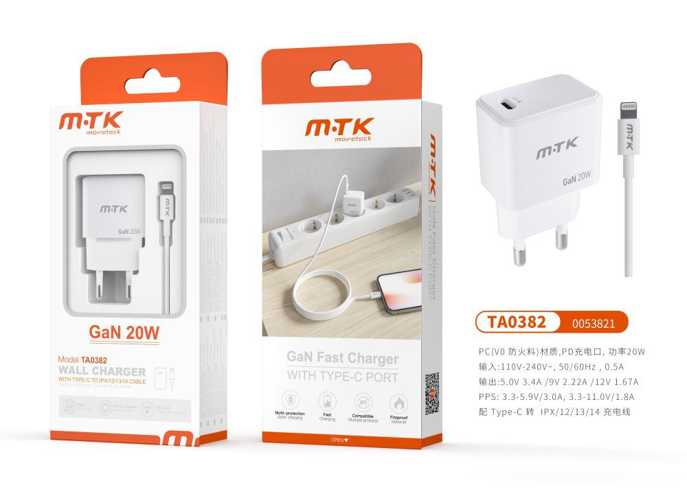 TA0382 BL Luxury Cargador GaN Rapido de Red Devin , 1 puerto Type-C PD, Con Cable Type-C a Lightning, 20W/3.4A(Max), Blanco