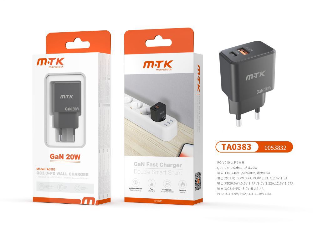 TA0383 NE Luxury Cargador GaN Rapido de Red Devin , 2 puerto(Type-C PD+QC 3.0), Sin Cable, 20W/3.4A(Max), Negro