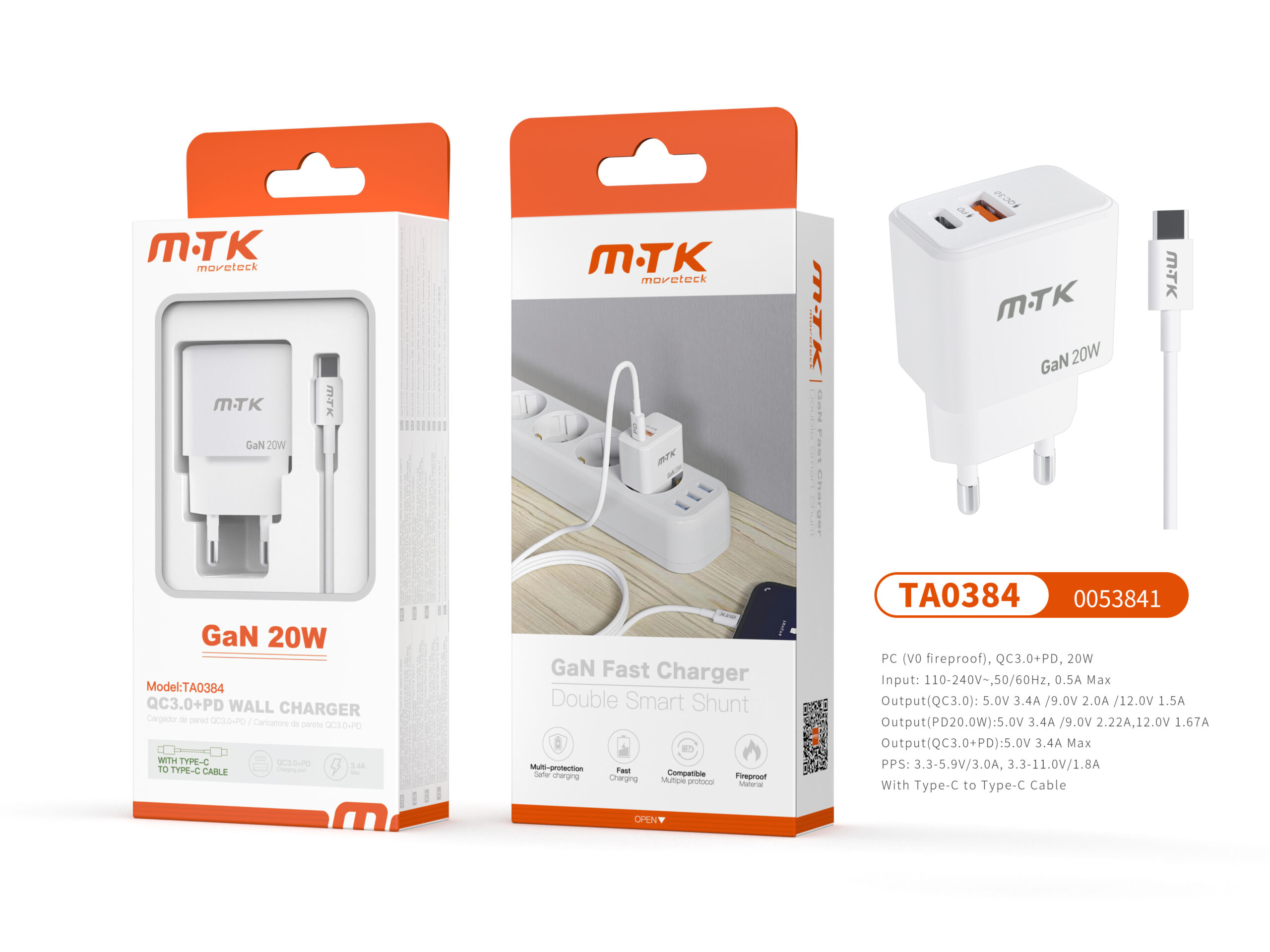 TA0384 BL Luxury Cargador GaN Rapido de Red Devin , 2 puerto(Type-C PD+QC 3.0), Con Cable Type-C a Tyep-C, 20W/3.4A(Max), Blanco