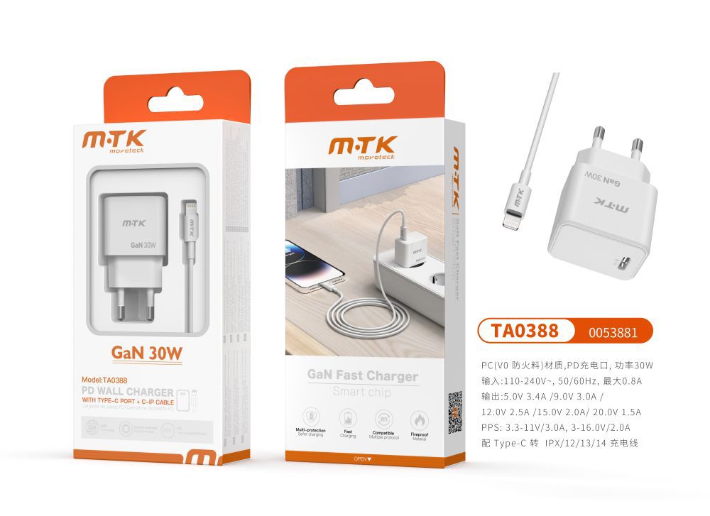 TA0388 BL Luxury Cargador GaN Rapido de Red Devin, 1 puerto USB-C PD, Con Cable Type-C a Lightning, 30W/3.4A(Max), Blanco