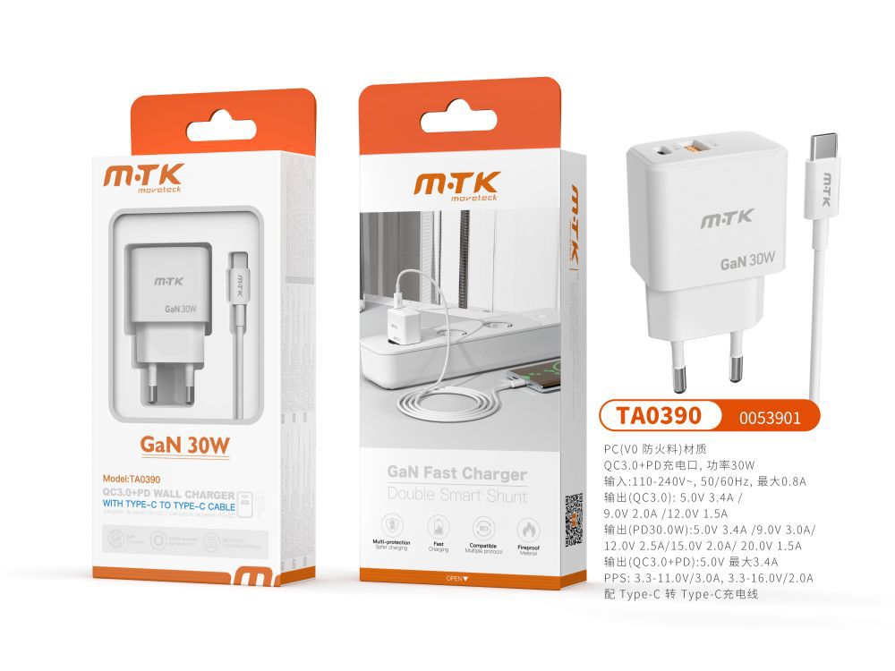 TA0390 BL Luxury Cargador GaN Rapido de Red Devin, 2 puerto USB-C PD+ USB-A QC 3.0, Con Cable Type-C a Type-C, 30W/3.4A(Max), Blanco