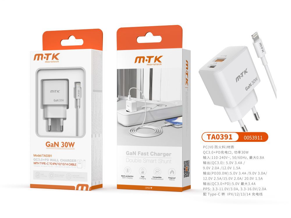 TA0391 BL Luxury Cargador GaN Rapido de Red Devin, 2 puerto USB-C PD+ USB-A QC 3.0, Con Cable Type-C a Lightning, 30W, 30W/3.4A(Max), Blanco