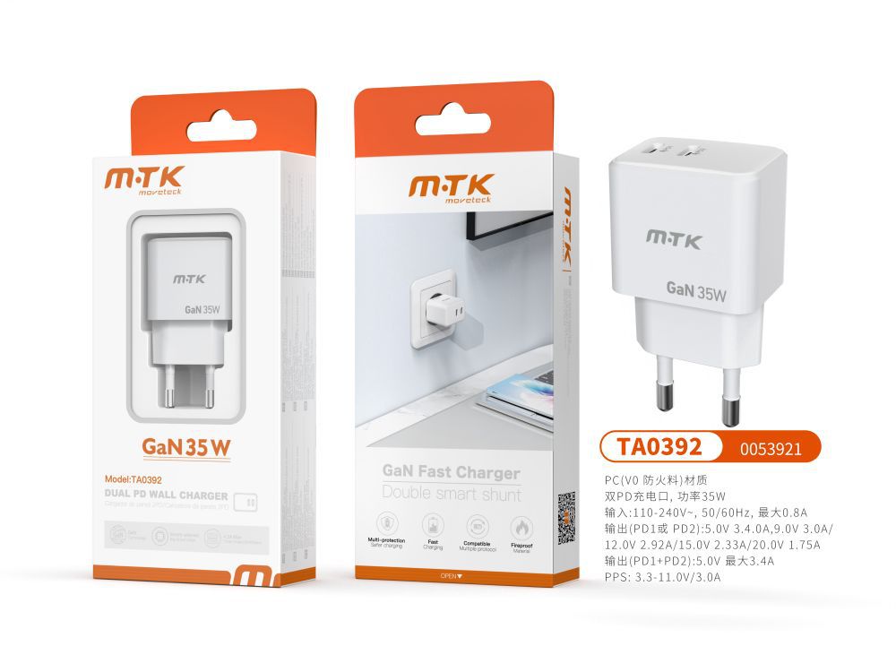 TA0392 BL Luxury Cargador GaN Rapido de Red Devin, 2 puerto USB-C PD, Sin Cable, 35W/3.4A(Max), Blanco