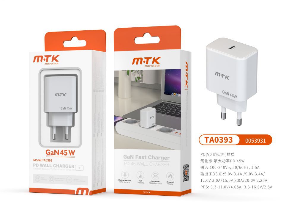 TA0393 BL Luxury Cargador GaN Rapido de Red Devin , 1 puerto Type-C PD, Sin Cable, 45W/3.4A(Max), Blanco