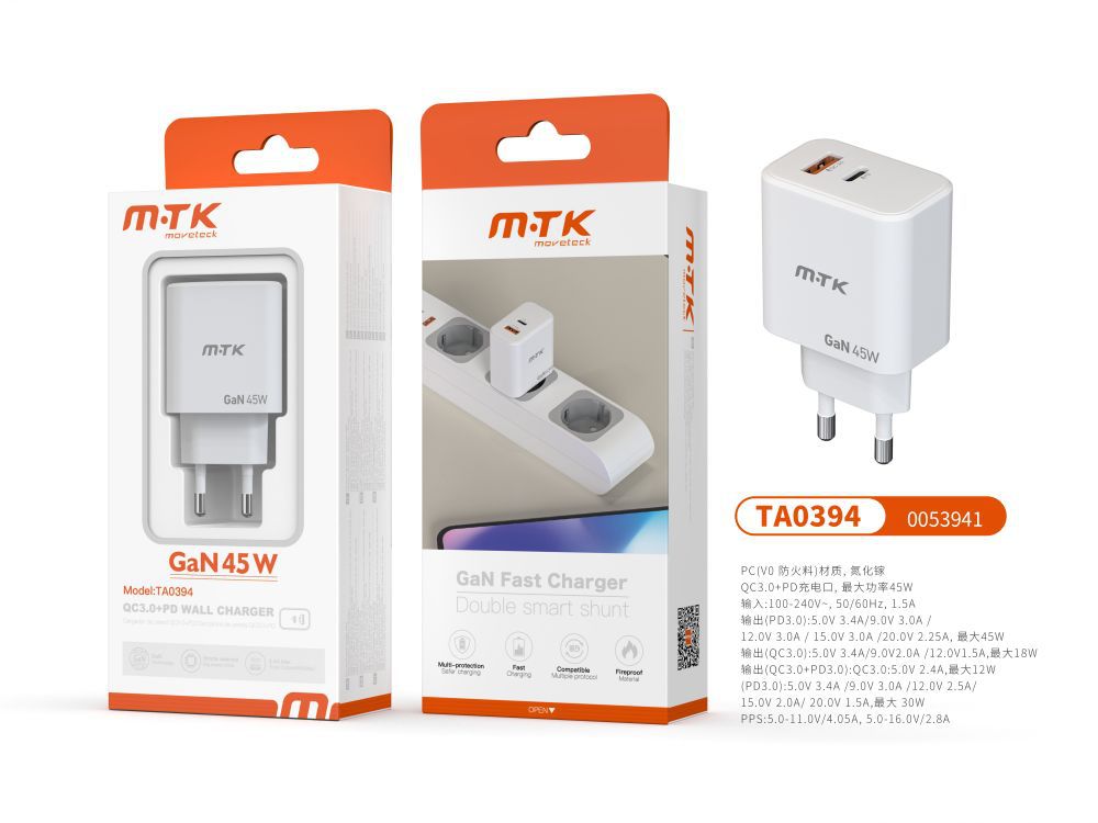 TA0394 BL Luxury Cargador GaN Rapido de Red Devin , 2 puerto(Type-C PD+QC 3.0), Sin Cable, 45W/3.4A(Max), Blanco
