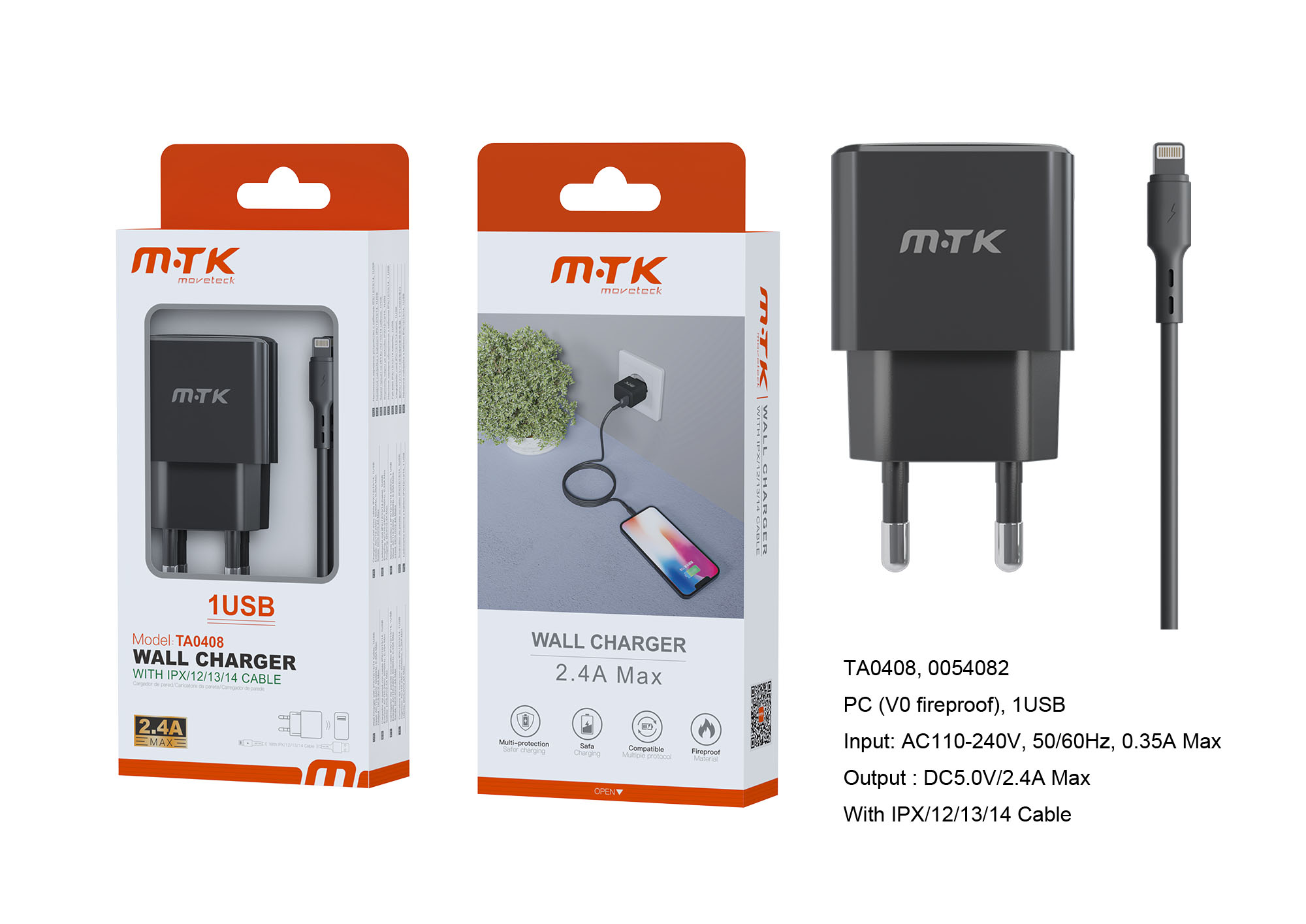 TA0408 NE Luxury Cargador de Red Ayme, 1 puerto USB-A, Con Cable Iphone 5-14, 2.4A(Max), Negro