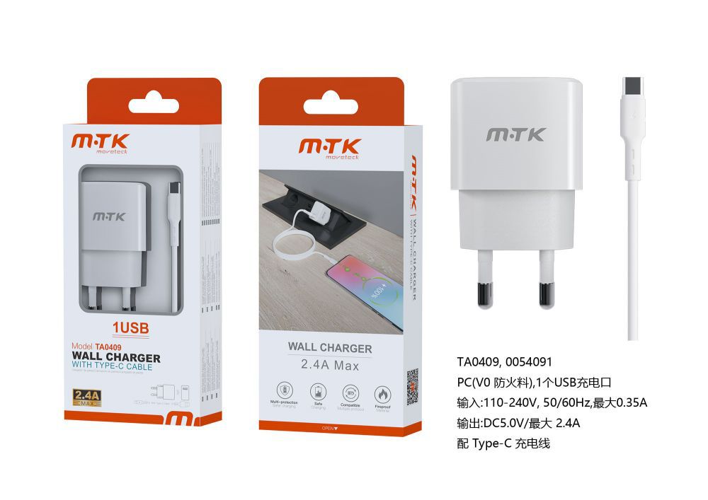 TA0409 BL Luxury Cargador de Red Ayme, 1 puerto USB-A, Con Cable Type-C, 2.4A(Max), Blanco