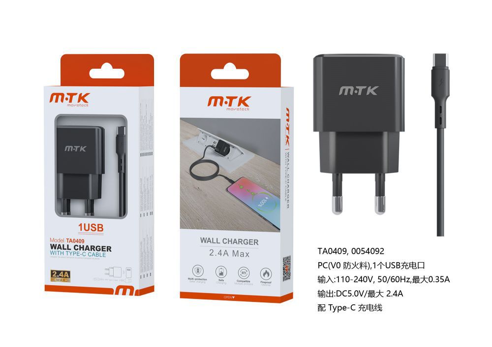 TA0409 NE Luxury Cargador de Red Ayme, 1 puerto USB-A, Con Cable Type-C, 2.4A(Max), Negro