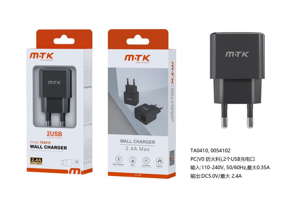 TA0410 NE Luxury Cargador de Red Ayme,2 puerto USB-A, Sin Cable, 2.4A(Max), Negro