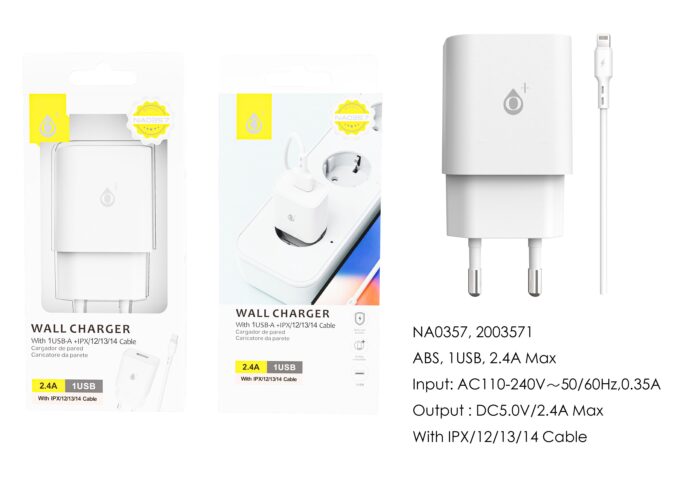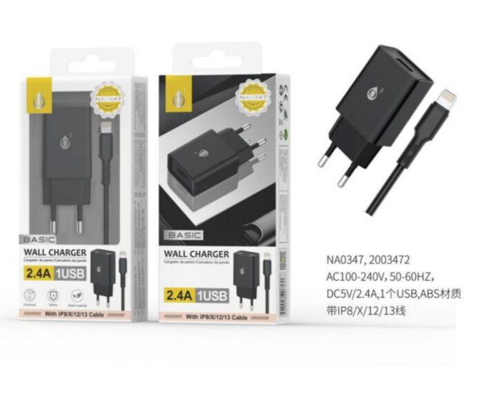 • TA0408 NE Luxury Cargador de Red Ayme, 1 puerto USB-A, Con Cable Iphone 5-14, 2.4A(Max), Negro