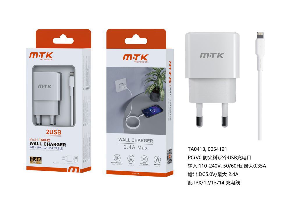 TA0412 BL Luxury Cargador de Red Ayme, 2 puerto USB-A, Con Cable Iphone 5-14, 2.4A(Max), Blanco