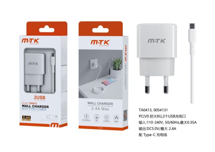 TA0413 BL Luxury Cargador de Red Ayme, 2 puerto USB-A, Con Cable Type-C, 2.4A(Max), Blanco
