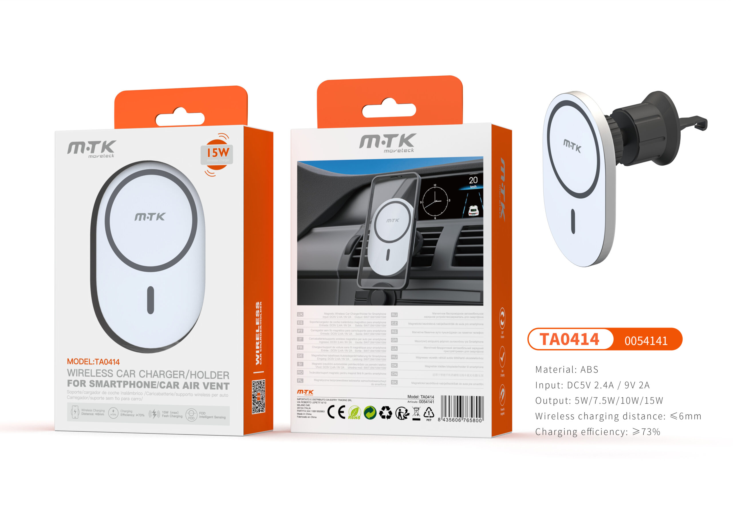 TA0414 BL Soporte Universal Magnetico de Movil para Airvent de coche, Soporta Carga Inalambrico 15W, Blanco