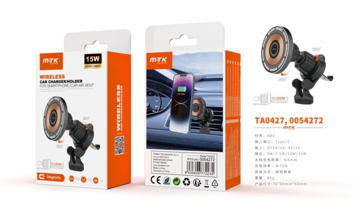 • TA0427 NE Soporte Universal Magnetico de Movil para Airvent de coche, Soporta Carga Inalambrica 15W, Negro