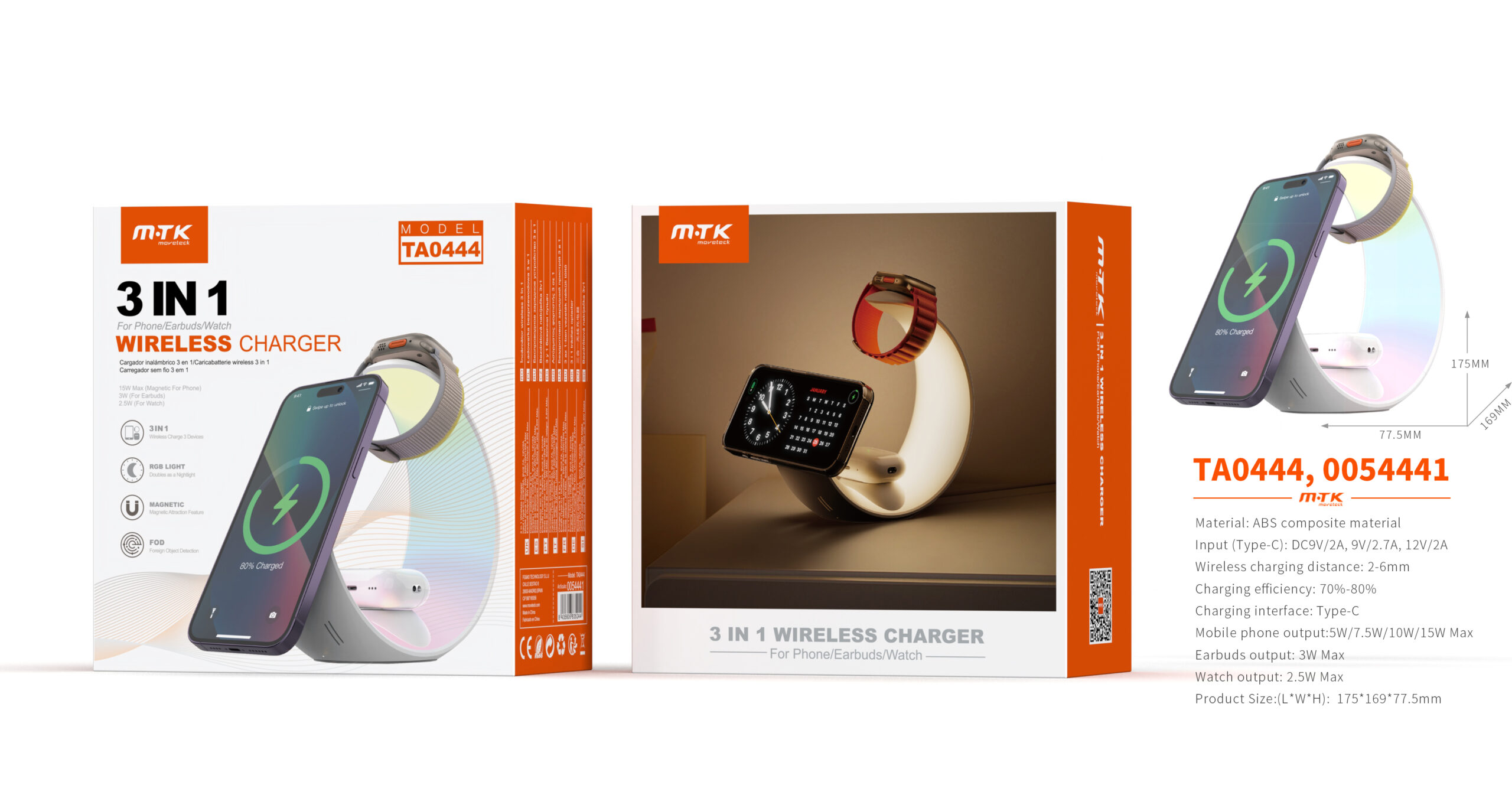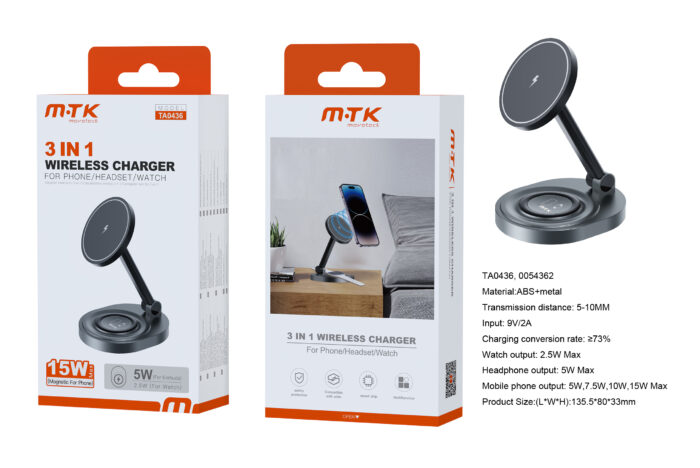 • TA0439 NE Cargador Inalambrico 3 en 1(Movil 15W/AirPods 3W/Iwatch 2W), Con Cable Type-C 9V/2A, Negro