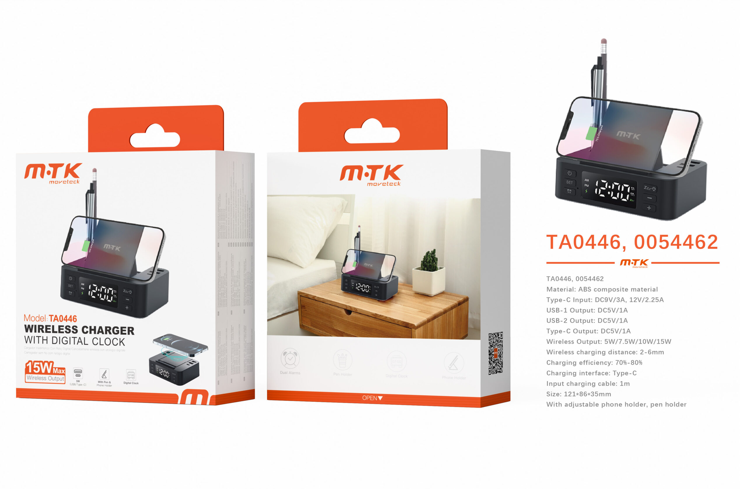 TA0446 NE Luxury Cargador inalambrico 15W con reloj digital y 2 salida USB-A 1 salida Type-C, Negro